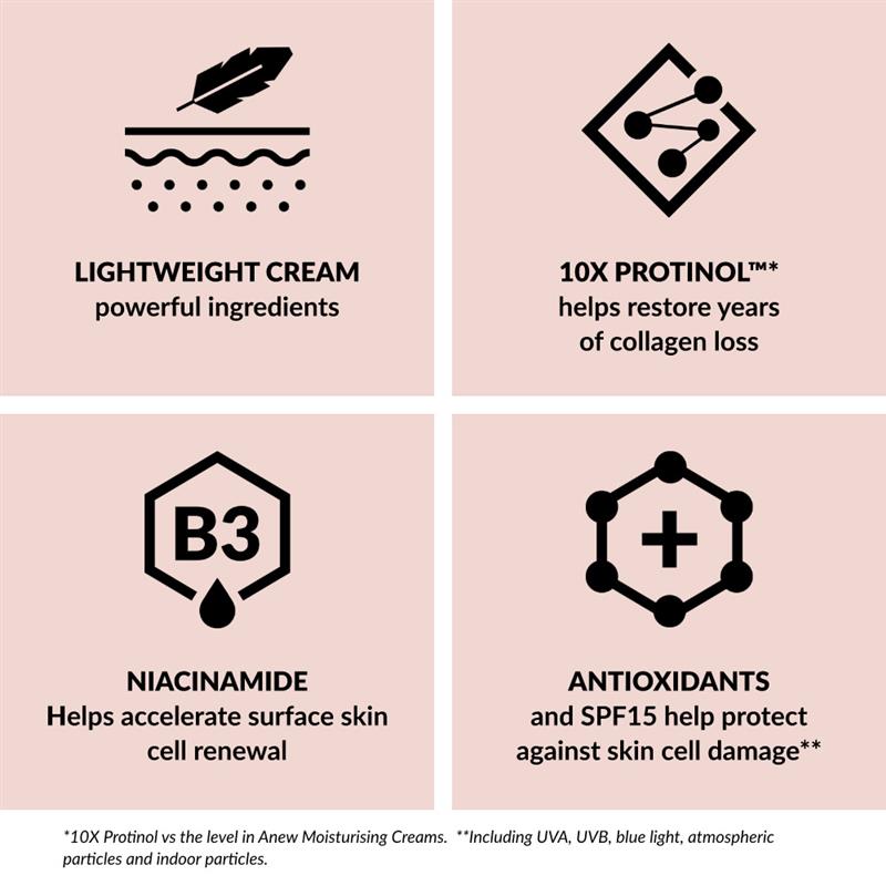 A formula with antioxidants, broad-spectrum UVA/UVB SPF 15 protection, 10x Protinol™ (our highest concentration) and Niacinamide – to help activate surface skin renewal and shield your skin.