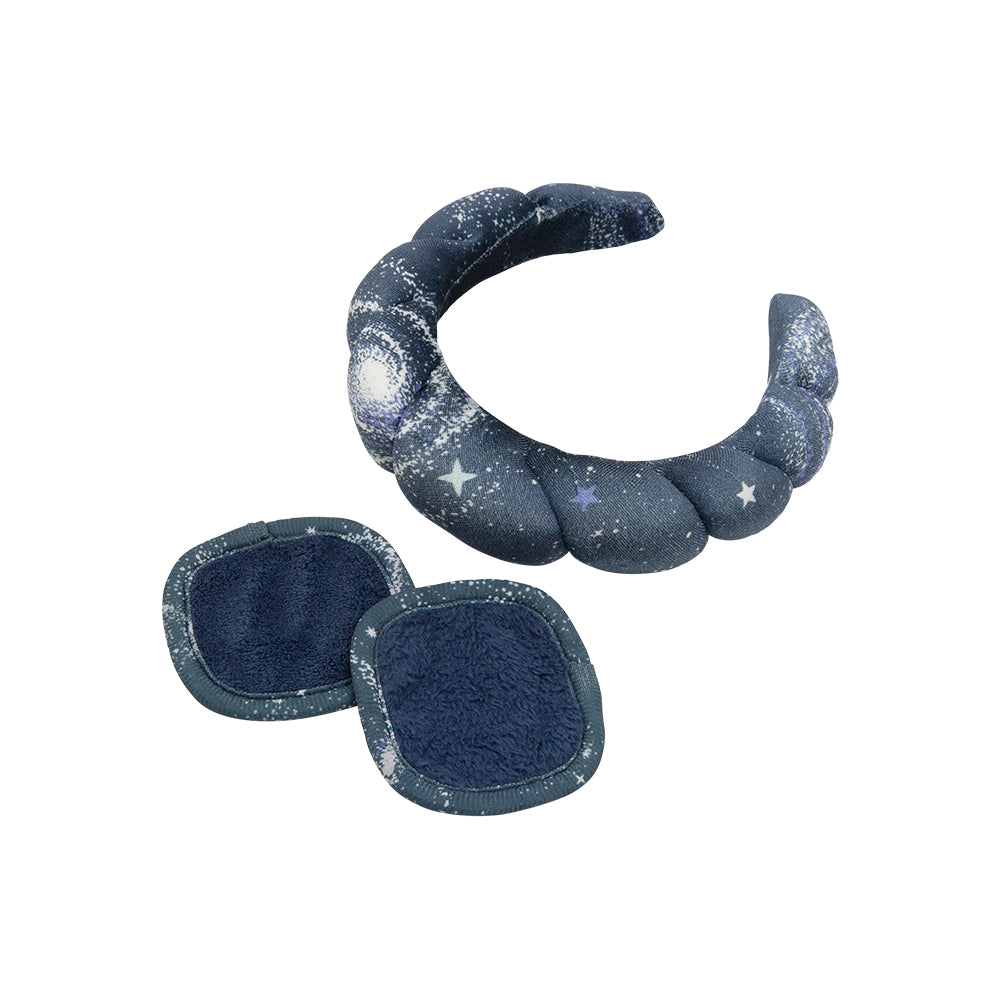 This beautiful, celestial print make-up removing set in navy comes with an oversized bubble headband that keeps your hair off your face when cleansing, and two microfibre facial rounds for an easy, effective cleanse.